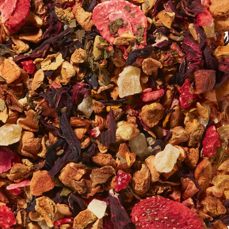 Ingredients: apple pieces, hibiscus blossom, pineapple cubes, sour apple pieces, aroma, sweet blackberry leaves, passion fruit, freeze-dried strawberry slice.
