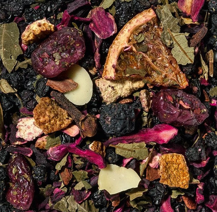 Ingredients: Elderberries, hibiscus, aronia berries, cranberries (cranberries, sugar, sunflower oil), sweet blackberry leaves, citrus peels, cinnamon, aroma, citrus slices, cloves, blueberries, cranberry slices, sliced almonds.