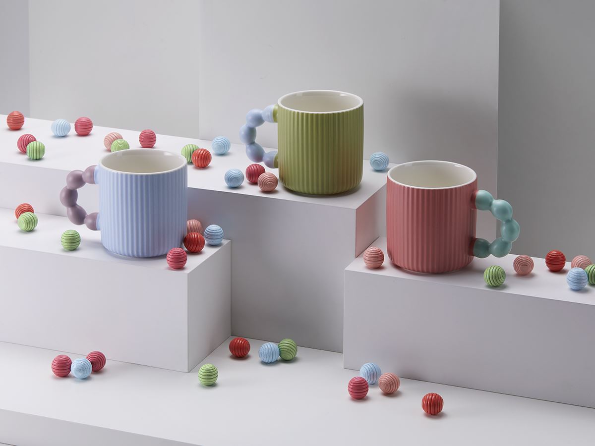Prachtige kleurrijke mokken met heel leuk detail aan het oor. Keuze uit 3 kleuren.