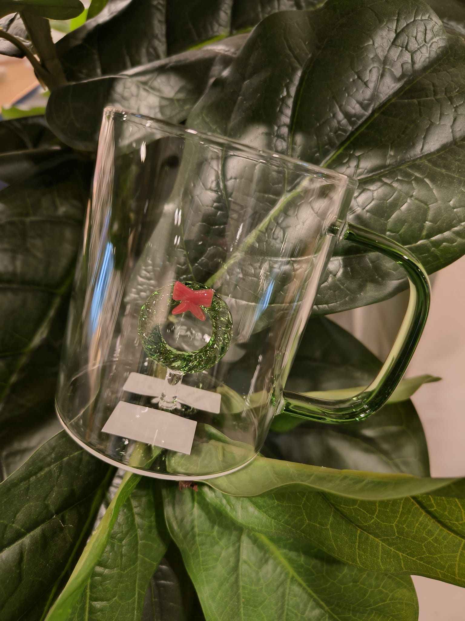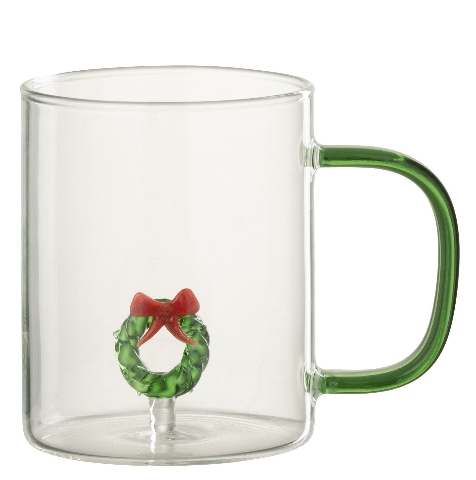 Prachtige glazen mok met gekleurd oor en 3D-kerstkrans binnenin. Ook beschikbaar met kerstboom.