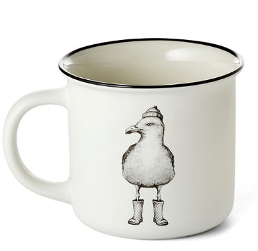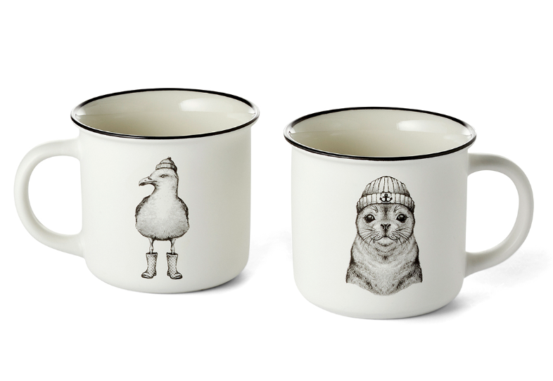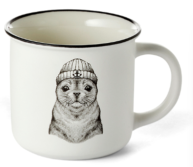 Theetas met design. Aan de ene kant van de tas staat een eendje, aan de andere kant een zeehond.