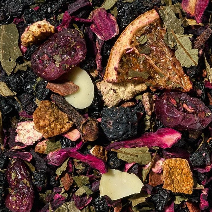 Ingrediënten: Vlierbessen, hibiscus, aronia bessen, veenbessen (veenbessen, suiker, zonnebloemolie), zoete bramenblaadjes, schillen van citrusvruchten, kaneel, aroma, plakjes citrus, kruidnagel, bosbessen, plakjes veenbessen , gesneden amandelen